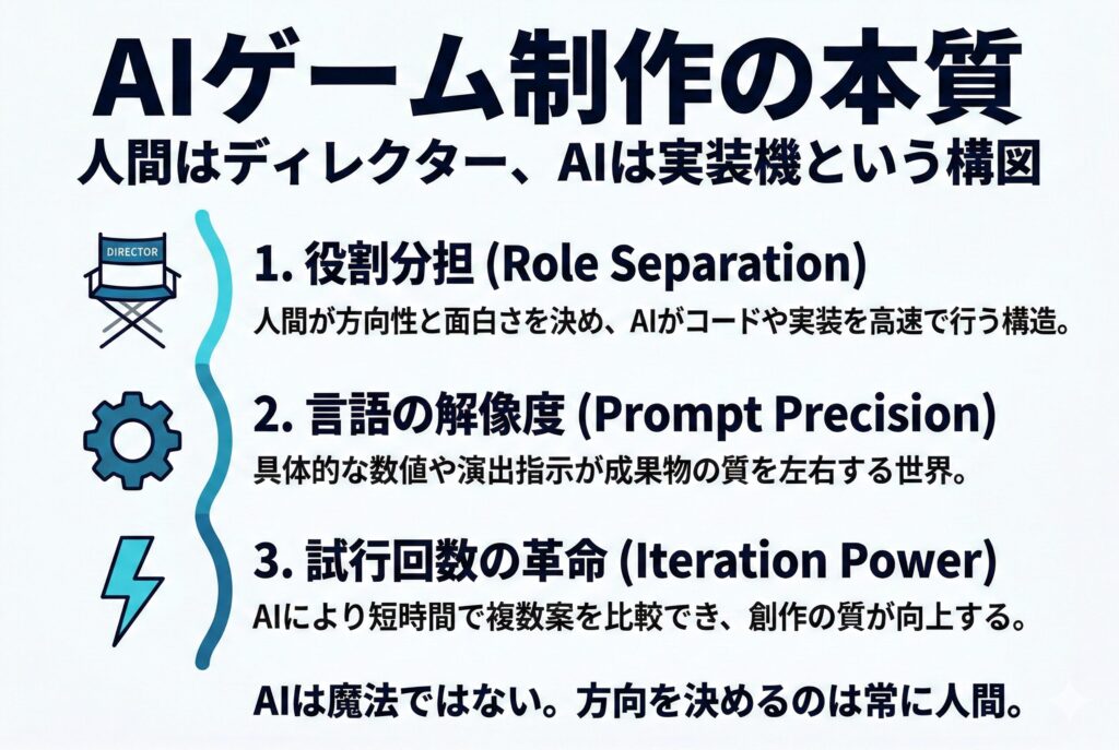 今回のAI ゲーム制作で、はっきり分かったことがあります。
