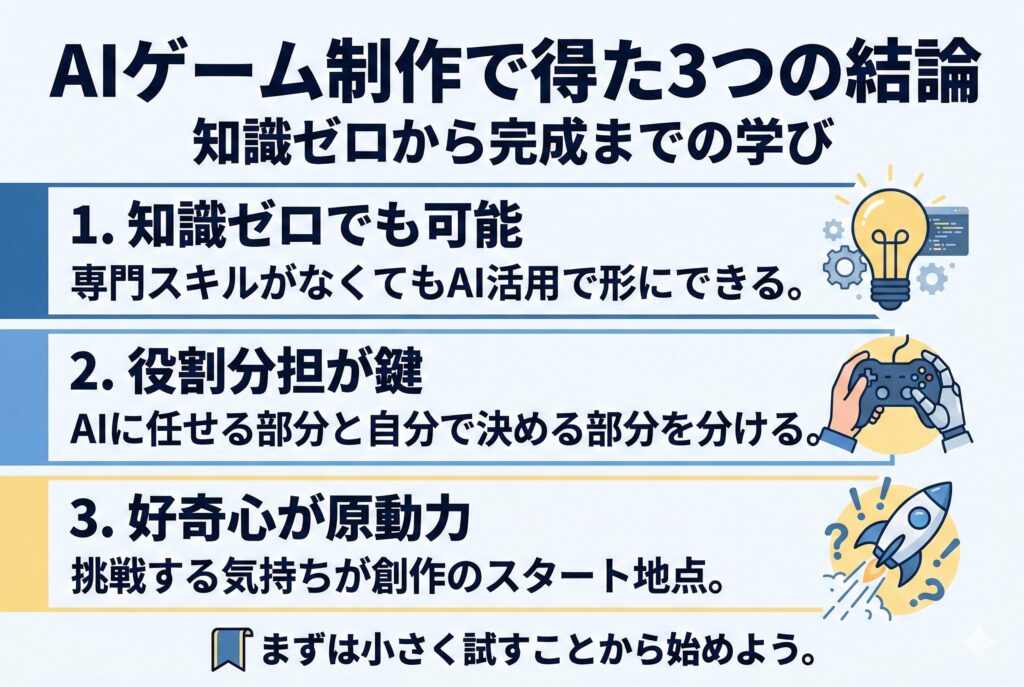 まとめ|AI ゲーム制作は才能ではなく挑戦で決まる